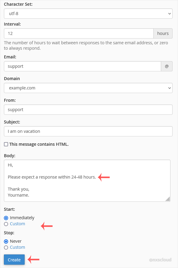 - Email: Enter your email address on which you want to enable autoresponder. To enable auto responder on support@example.com, enter support in the email field.