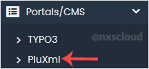 4. On the left side, locate the Portal/CMS category. Click on it and then on the PluXml link that appears.